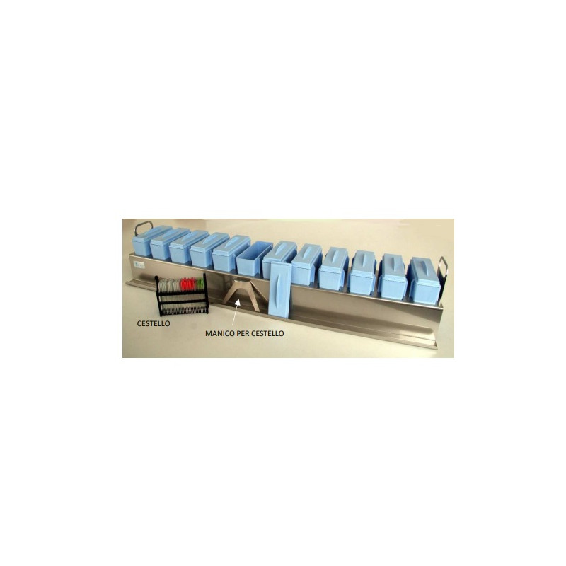 Il kit include inoltre un cestello porta vetrini da 30 posti, dimensioni 108 x 30 x 90 mm, e un manico rimovibile che consente un inserimento e un’estrazione agevoli del cestello nelle vaschette.