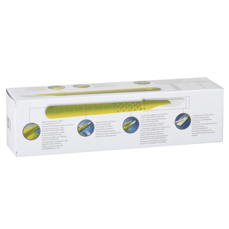 - Coprilama di Sicurezza: Ogni bisturi è dotato di un coprilama antiscivolo che garantisce la massima sicurezza durante il trasporto e l'utilizzo.
