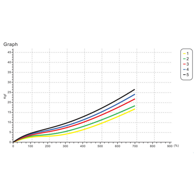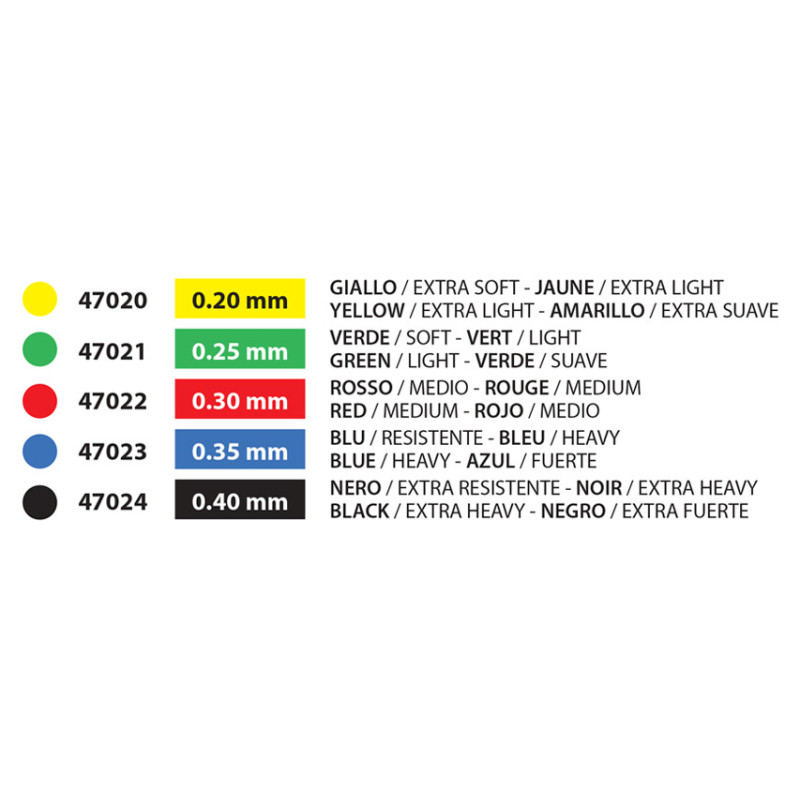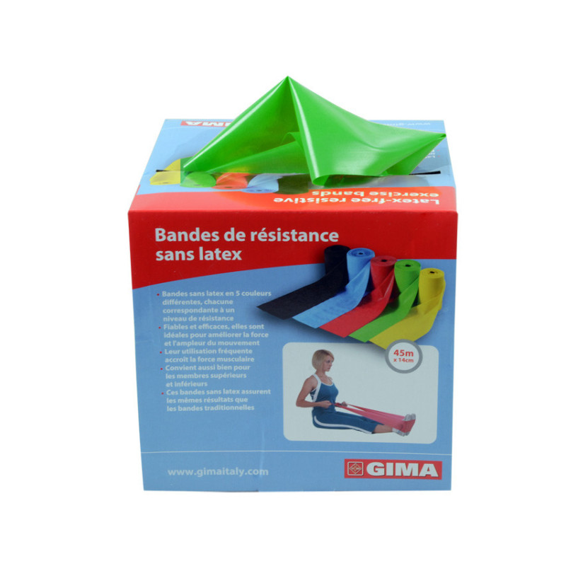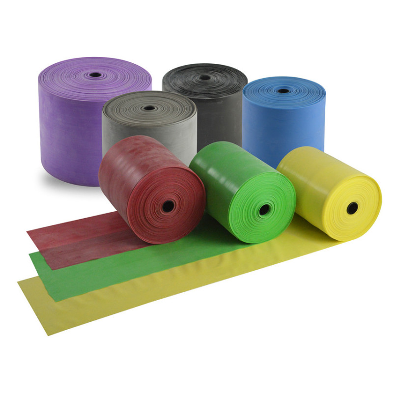 Fasce senza lattice in 7 colori relativi ai diversi livelli di resistenza e 3 lunghezze (1,5, 5,5 e 45 m).