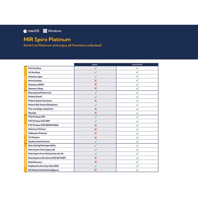 Il Spirometro Mir Spirodoc è dotato di una serie di funzionalità avanzate che lo rendono uno strumento indispensabile per la diagnosi e il monitoraggio delle patologie respiratorie: