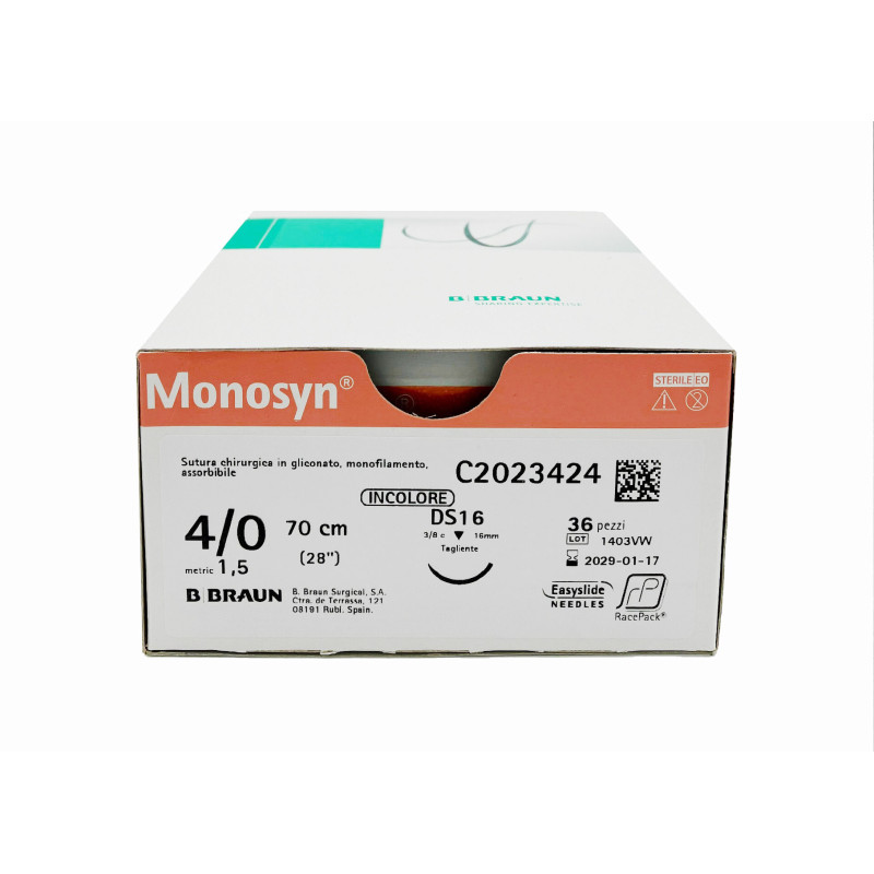 - Affidabilità e sicurezza: grazie alla loro elevata resistenza e sicurezza dei nodi, le suture Monosyn garantiscono una chiusura efficace e duratura dei tessuti.